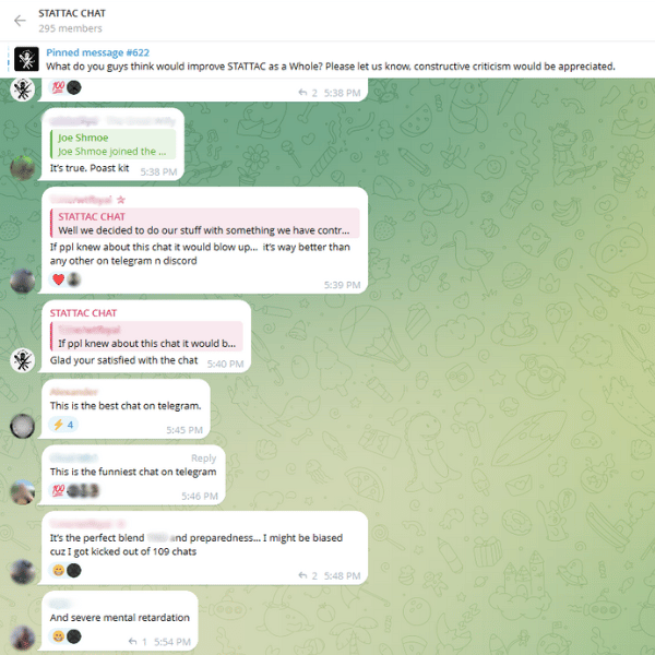 Arguably one of the #1 reasons to join STATTAC, our chat channel is open to like-minded men who like to train, larp, and encourage eachother to become better men.